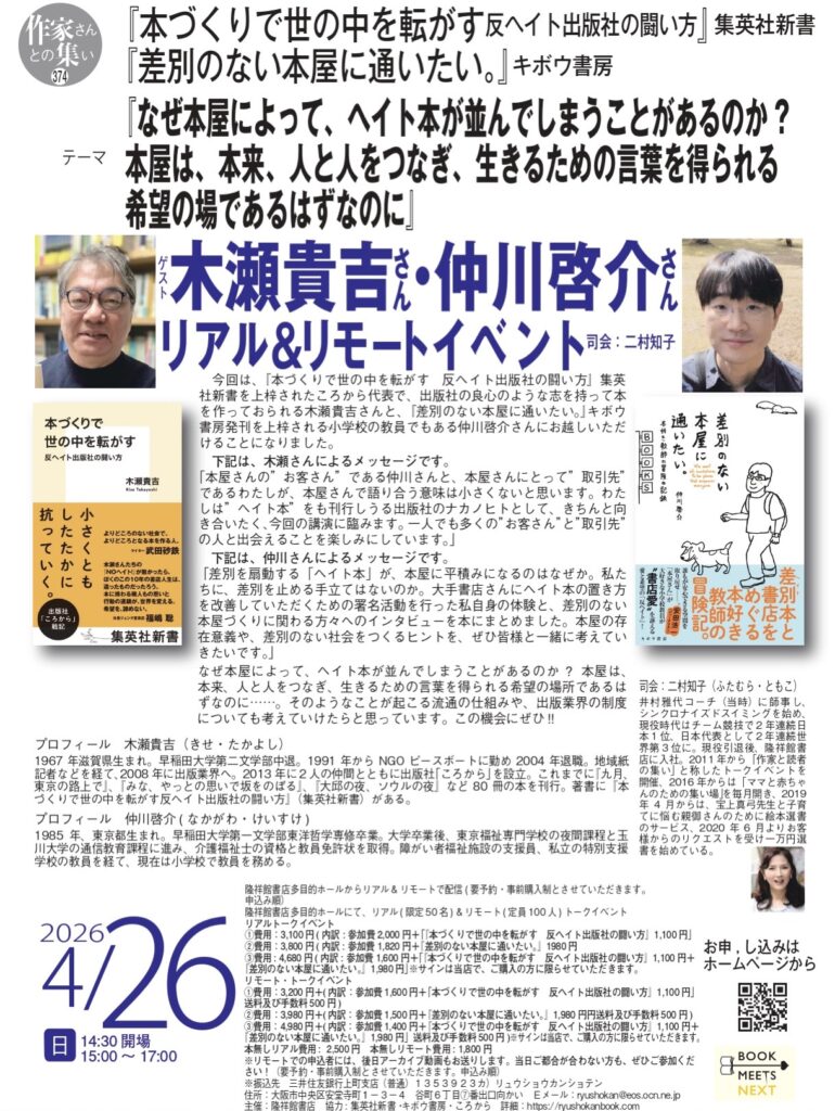 差別を扇動する「ヘイト本」が書店に平積みにされてしまう仕組みや、書店がもつ可能性など、差別の問題や書店のあり方について、幅広く話し合うトークイベントです。