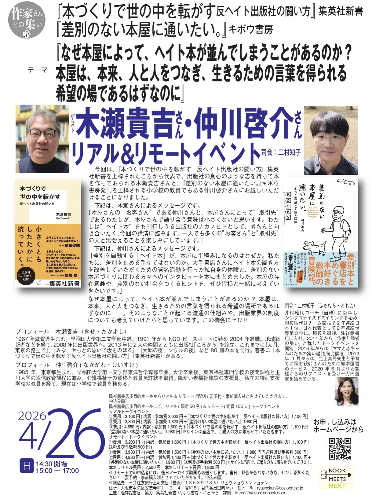 日時は、4/26(日)の15時からです。オンライン配信(後日アーカイブ動画の配信もあり)も行いますので、ぜひご参加ください。